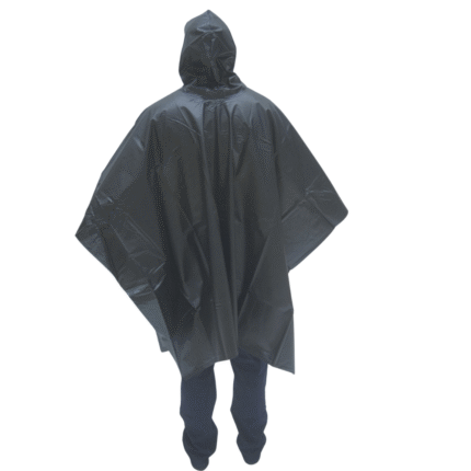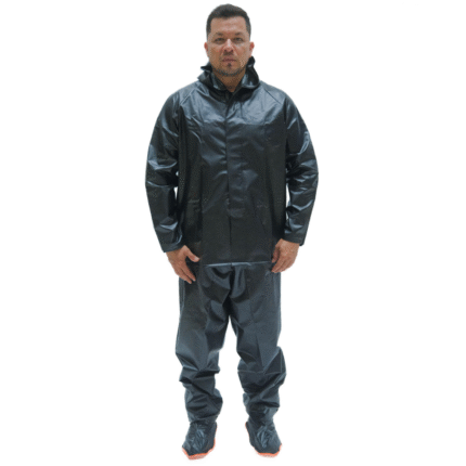 El conjunto impermeable de dos piezas en PVC color negro Protección integral, chaqueta y pantalón que cubren completamente el cuerpo contra lluvia y salpicaduras. El PVC actúa como barrera efectiva frente a agua y humedad de alta visibilidad, el color negro con reflectivos facilita la identificación del trabajador en condiciones de poca luz o alto tránsito.