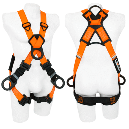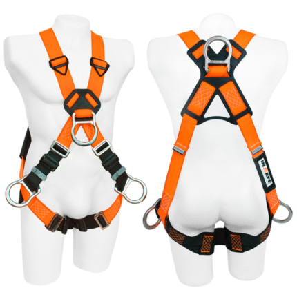 Elemento parte de un sistema personal de detención de caídas, arnés Dieléctrico en reata polyester de alta tenacidad estilo en X posee una argolla dorsal en “D” dieléctrica para la detención y restricción de caídas, y argollas laterales en “D” dieléctricas para posicionamiento a un punto fijo, argolla frontal en “D” dieléctrica para ascenso y descenso controlado. Rango de capacidad: mínimo 130 lbs - máximo 310 lbs (1 persona) incluyendo uniforme, equipos y cualquier herramienta del trabajador, conforme ANSI Z359.11-2021 y resolución colombiana 4272 de 2021.