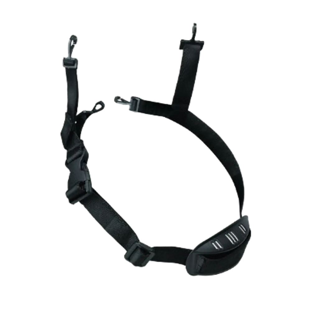 Está elaborado en cinta de poliéster de alta resistencia, con cuatro puntos de anclaje que se fijan al casco: dos laterales, uno frontal y uno posterior, lo que garantiza una distribución equilibrada de la presión y un ajuste seguro. Su diseño ergonómico reduce la incomodidad en el rostro y el cuello, incluso durante largas jornadas de uso.