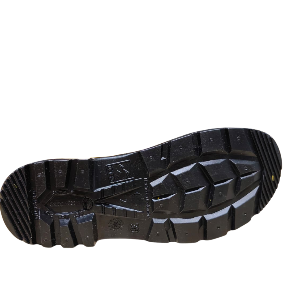 Suela antideslizante: fabricada con un patrón profundo de canales y relieves, garantiza tracción en superficies resbaladizas como barro, aceite o pisos mojados.