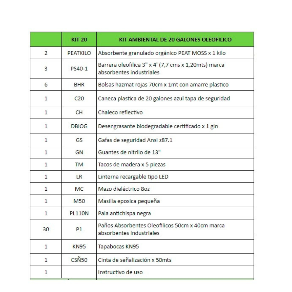 El Kit Ambiental 20 Galones Full Contingencia es un equipo integral diseñado para la atención, control y limpieza de derrames de hidrocarburos, aceites, combustibles, solventes y otras sustancias contaminantes. Gracias a su capacidad de 20 galones, resulta ideal para empresas del sector industrial, transporte, construcción, talleres, estaciones de servicio y demás espacios donde existe riesgo de fugas o derrames.