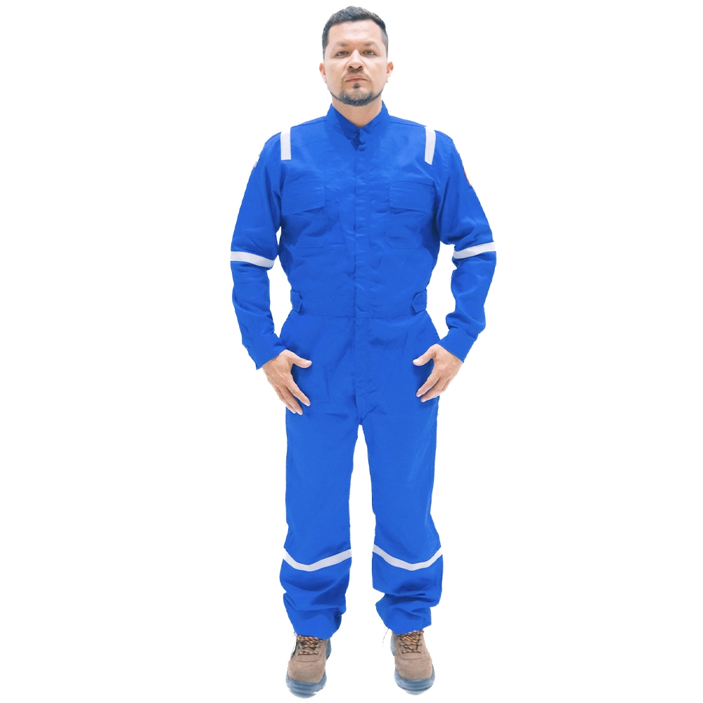 El Overol ignífugo azul rey unisex está confeccionado en 100 % algodón ignífugo, tejido tipo sarga 3/1 con acabado FR, de gramaje aproximado 7 oz (~ 238 g/m²), que aporta resistencia térmica sin sacrificar comodidad. Diseñado para cumplir con estándares de protección HRC1 y HRC2, es ideal para ambientes industriales, petroleros, soldadura o labores con riesgo térmico.